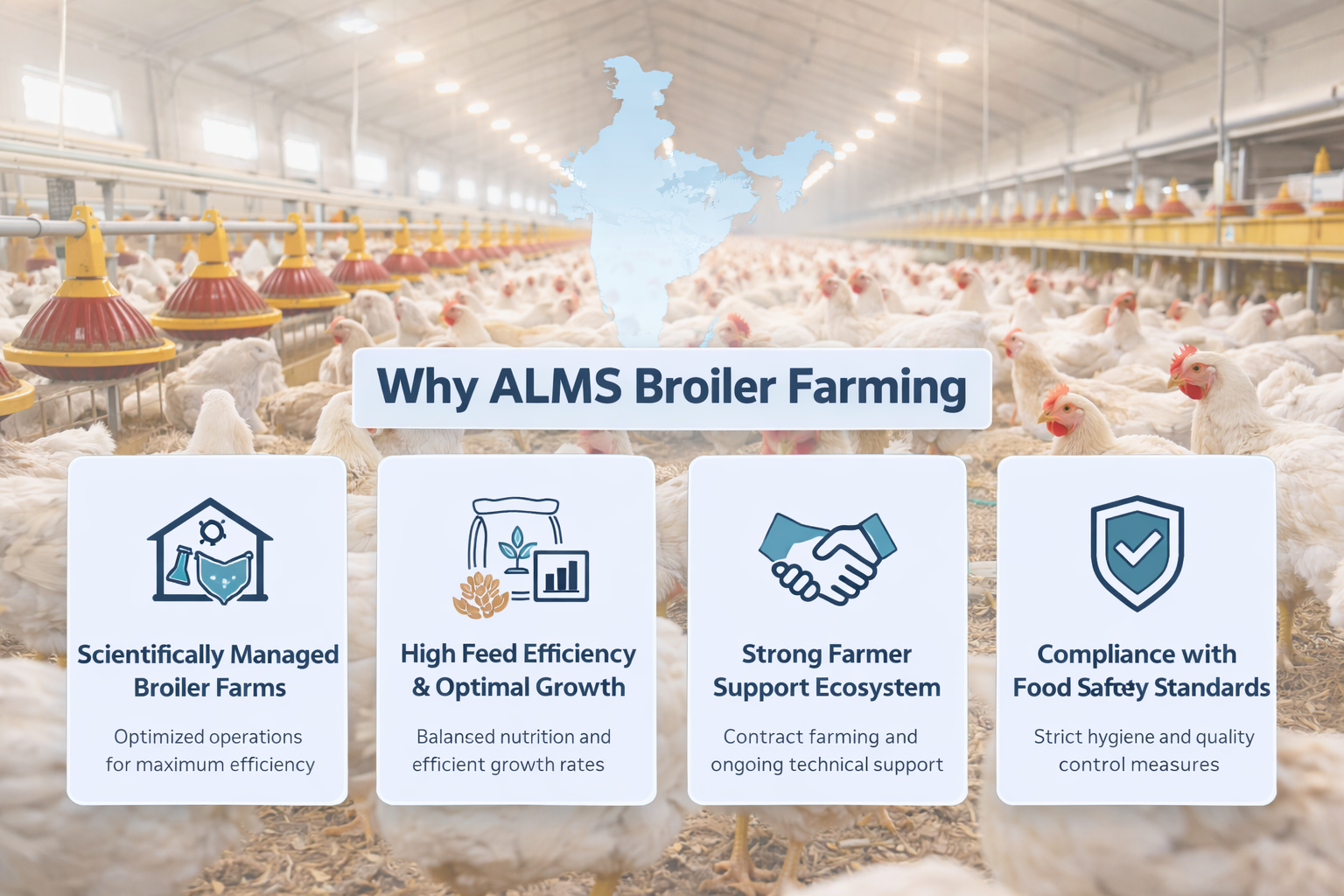 ALMS Group’s Broiler Farming operations are designed to deliver high-quality chicken through efficient, responsible, and scalable farming practices. As a key vertical under our poultry division, broiler farming plays a vital role in meeting India’s growing demand for safe and nutritious protein. With a focus on bird health, optimal growth, and food safety, ALMS follows an integrated broiler farming model that ensures consistency and quality from farm to market.